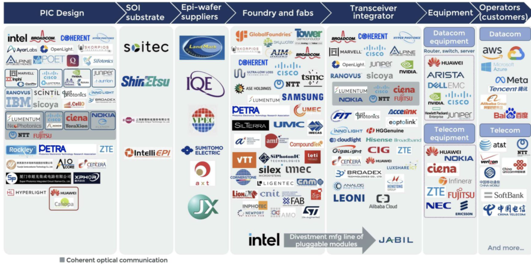 硅光产业链覆盖从原材料到终端应用的完整环节,上游包括硅基材料供应商,提供制造硅光模块所需的基础材料,如硅片、SOI衬底等;中游是硅光模块产业链的核心部分,包括硅光芯片的设计、制造、封测等环节;下游应用端覆盖光模块厂商、电信设备商/运营商、互联网/云计算厂商等。