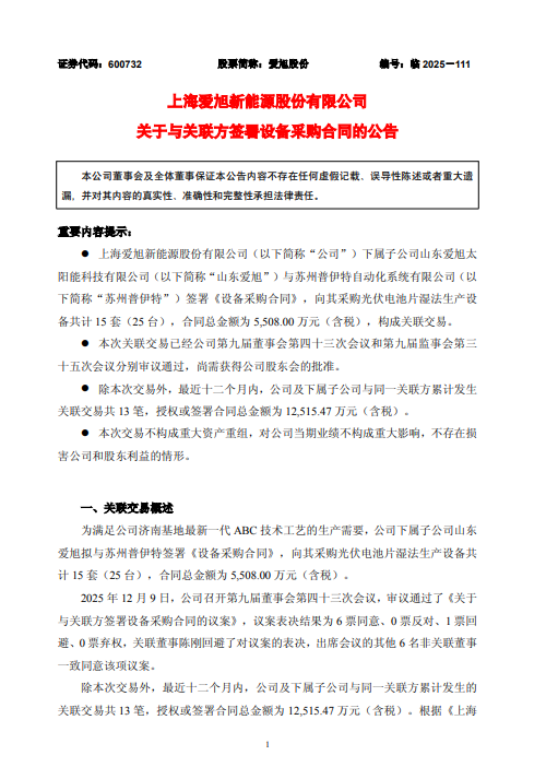 12月10日,爱旭股份(600732)公告称,公司下属子公司山东爱旭太阳能科技有限公司(以下简称“山东爱旭”)与苏州普伊特自动化系统有限公司(以下简称“苏州普伊特”)签署《设备采购合同》,向其采购光伏电池片湿法生产设备共计15套(25台),合同总金额为5,508.00万元(含税),构成关联交易。