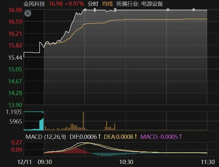 新能源概念股早间全线走强,风电设备方向领涨,板块指数高开高走,放量大涨逾3%,仅约1小时成交就超过昨日全天成交。金风科技强势涨停,双一科技、泰胜风能、运达股份、明阳智能等涨幅居前。
