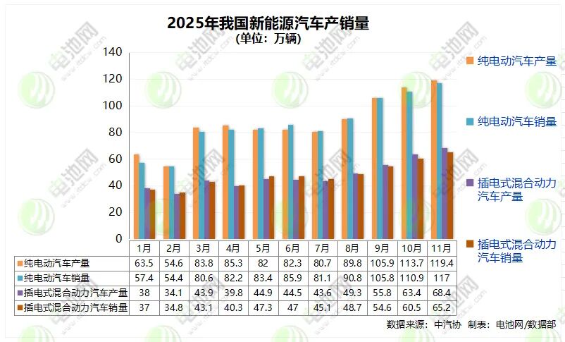 1-11月,新能源汽车国内销量占汽车国内销量比例为50.3%;新能源乘用车国内销量占乘用车国内销量比例为53.6%;新能源商用车国内销量占商用车国内销量比例为25.7%。