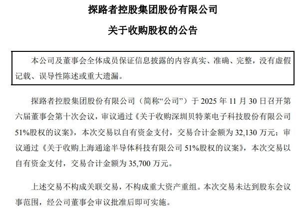 2025年12月1日晚,探路者发布公告,宣布以约6.8亿元现金方式收购深圳贝特莱电子科技股份有限公司及上海通途半导体科技有限公司各51%股权。两家公司分别在人机交互芯片和显示处理芯片领域占据市场份额第一。