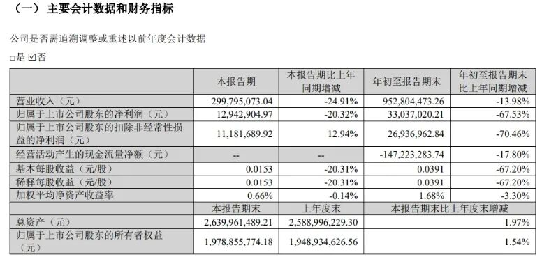 根据公司财报,2025年前三季度,公司营业收入为9.53亿元,同比下降13.98%;归母净利润为3304万元,同比下降67.53%;扣非归母净利润为2694万元,同比下降70.46%。
