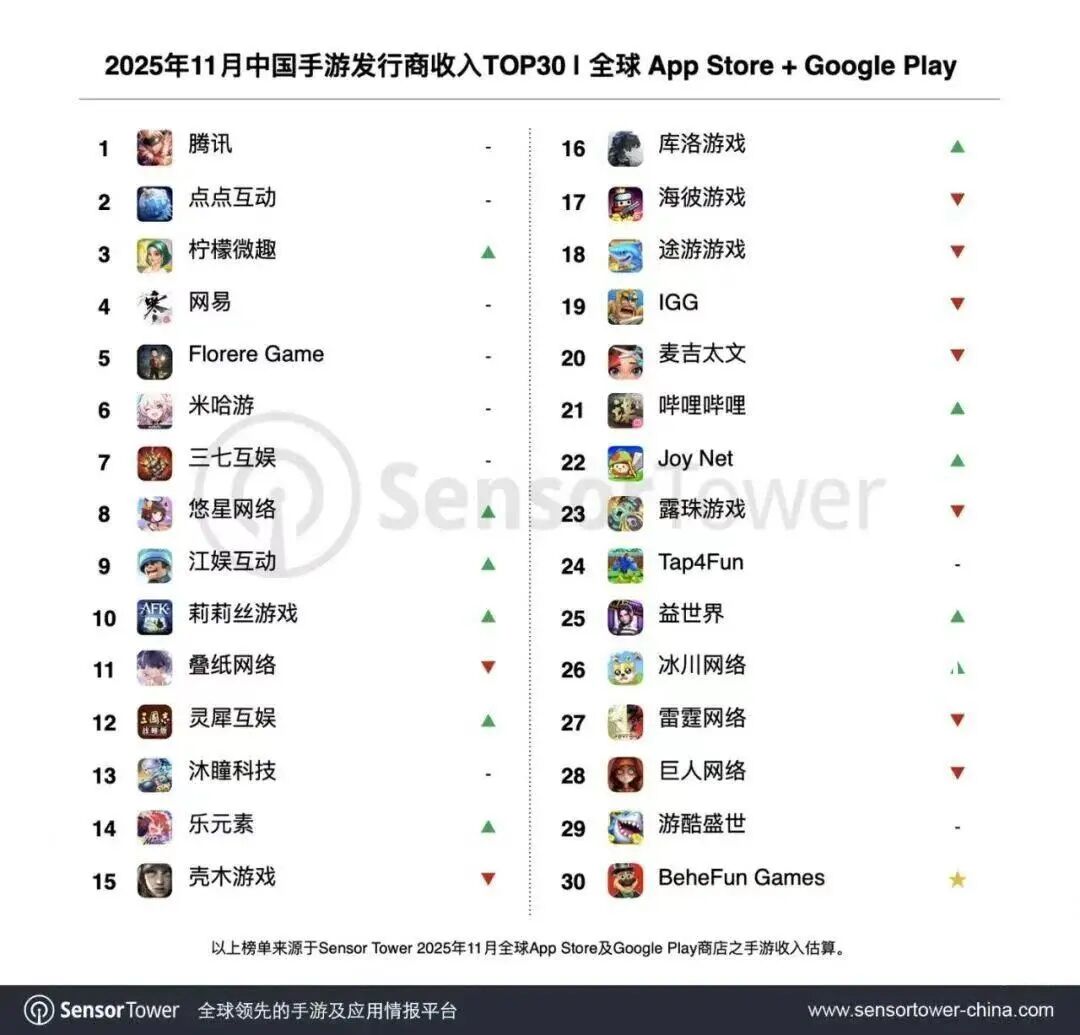 根据SensorTower12月8日发布的《2025年11月中国手游发行商全球收入排行榜》,点点互动收入继续位列亚军,仅次于腾讯,超过柠檬微趣和网易。报告提到,核心支柱《Whiteout Survival》和新作《Kingshot》表现强劲,形成“双轮驱动”。