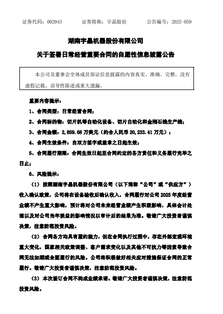 12月11日,宇晶股份(002943)发布关于签署日常经营重要合同的自愿性信息披露公告。
