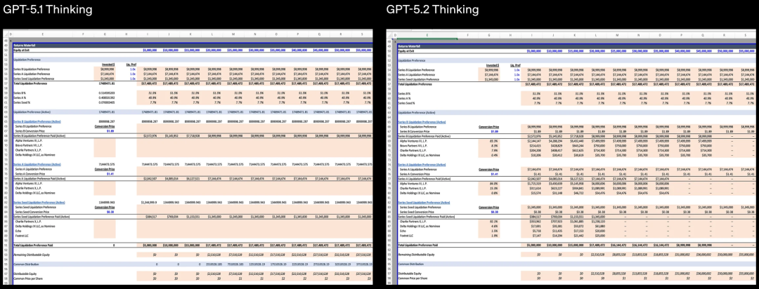 而GPT-5.1 Thinking不仅错误地计算了种子轮、A轮和B轮的清算优先权,且大部分行都留白了,导致最终的股权回报计算出错;而且还错误地在表头行中插入了计算公式。