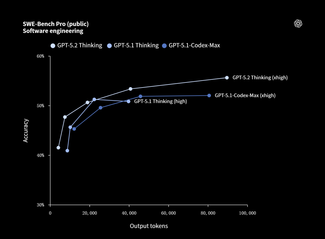 在对现实世界软件工程基准SWE-Bench Pro上,GPT‑5.2 Thinking创下了55.6%的新纪录。