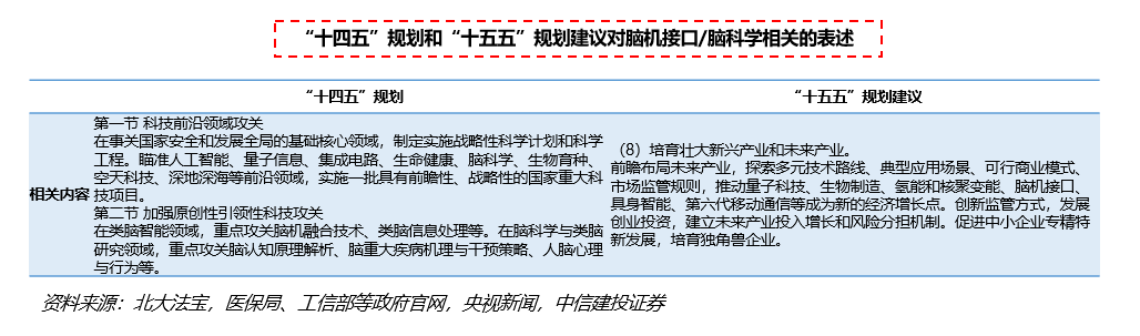 1)国家顶层设计对脑机产业化的重视程度提升。10月28日,“十五五”规划建议发布,建议提出前瞻布局未来产业,探索多元技术路线、典型应用场景、可行商业模式、市场监管规则,推动脑机接口等产业成为新的经济增长点。从“十四五”规划提出加强脑科学和类脑研究的科技攻关,到“十五五”规划明确将脑机接口列为未来产业,足见国家顶层设计对脑机接口产业化的重视。