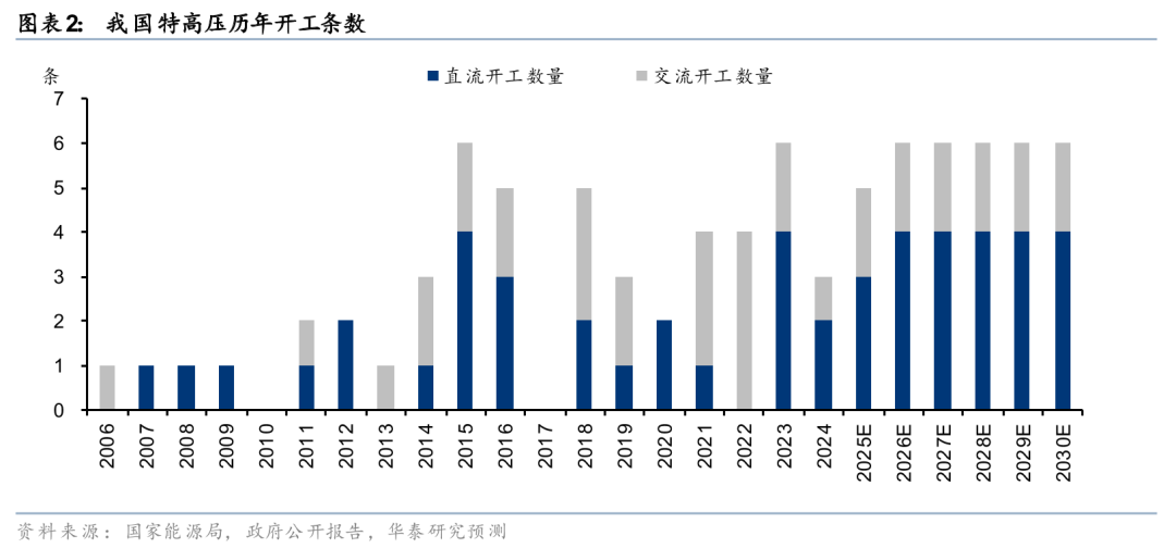 展望十五五,我们预计特高压年均开工量或在“4直2交”高位,订单盘充足。展望十五五,当前披露的在储备项目较多,包括直流:青海-广西、库布齐-上海、腾格里-江西、乌兰布和-京津冀鲁、内蒙古-江苏、青海海南外送、松辽-华北、内蒙古-华东;交流:大同-巴彦淖尔、大同-包头、长治-南阳第二回、赣江-赣南等诸多特高压项目。我们预计年均开工量或在“4直2交”,订单盘充足;同时,网外的大型火电厂、核电厂开始逐步直接接入特高压网架,网外设备需求提升。