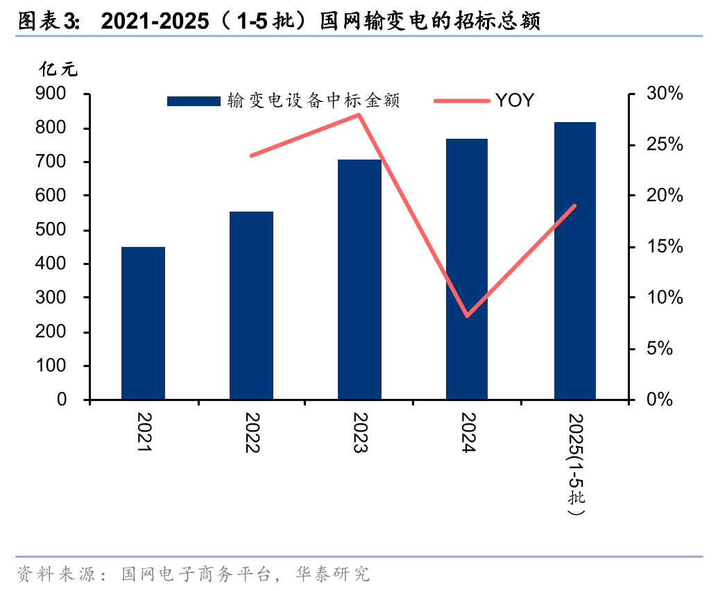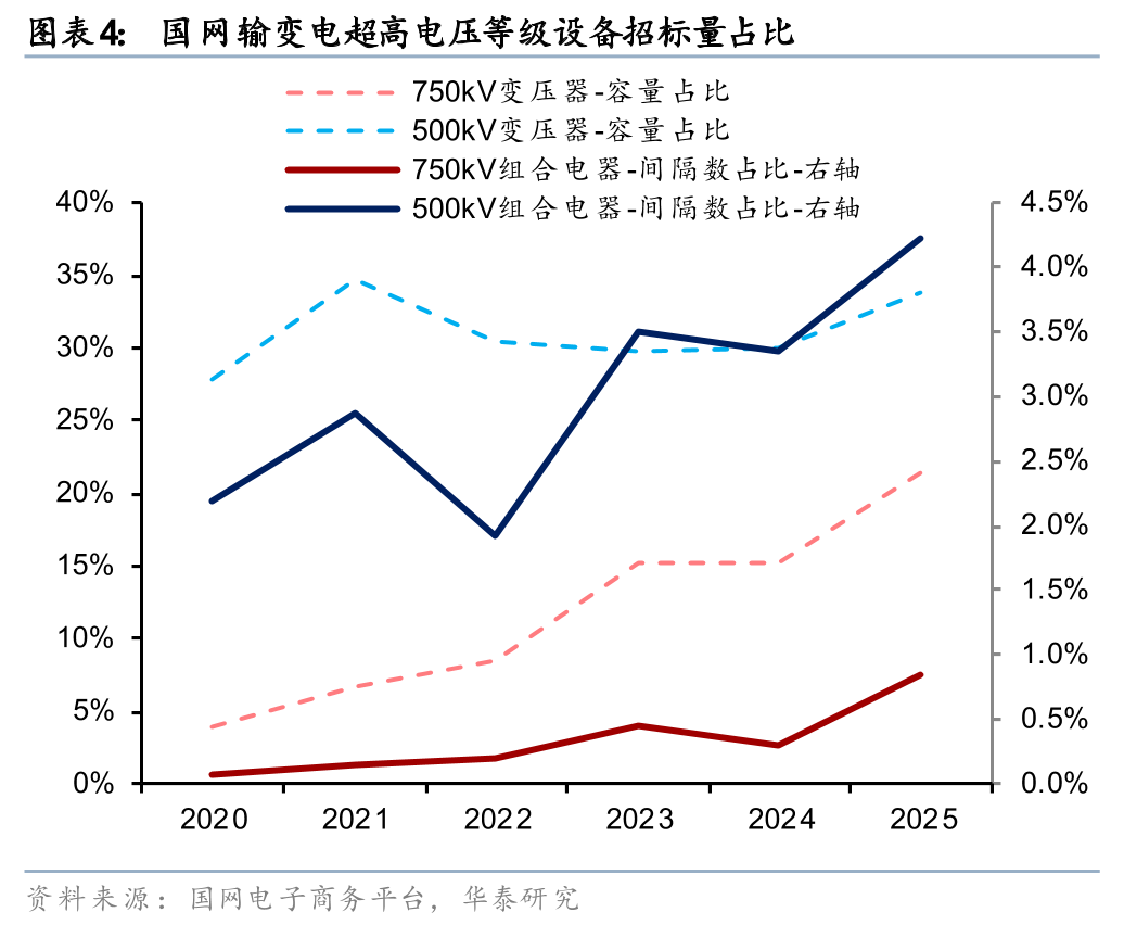 非特高压主网投资有望进一步提速,全国统一电力市场建设下,跨省输电通道建设与西部薄弱电网补强需求明确。一方面,需要加强区域间的电网互联互济能力,高电压主网网架互通是全国统一电力大市场搭建的底层支撑;另一方面,西部区域逐渐成为我国能源的“富矿区”,外送需求迫在眉睫,当前西部主网架不能满足电力外送要求,需要建设更强大的主网网架。从近年来的招标数据来看,750、500kV设备招标需求快速提升,其中750kV变压器招标容量占比从2020年的3.9%提升至2025年的21.4%,容量提升11.2倍;750kV组合电气招标间隔数占比从2020年的0.1%提升至2025年的0.8%,数量提升12.6倍。25年1-5批国网输变电招标金额同比增速达到19.1%,我们预计2026年有望进一步加速。