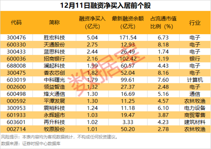 具体到个股,12月11日获融资净买入千万元以上的有377只,其中14只融资净买入额超1亿元。胜宏科技融资净买入额居首,当日净买入5.04亿元;其次是天通股份、蓝思科技,融资净买入金额分别为2.75亿元、2.44亿元;融资净买入金额居前的还有招商银行、澜起科技、香农芯创等。