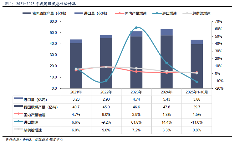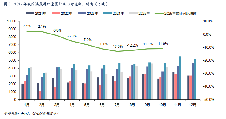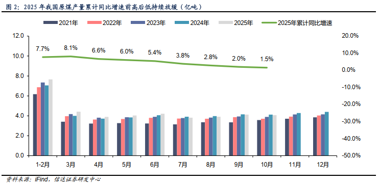 ⚫ 供给刚性约束,煤炭产量增速平稳。2025年以来,我国煤炭供给端呈现“国内产量低速增长、进口显著收缩”的特征,总体供给已进入低速增长区间。