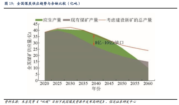 碳达峰前后全国煤炭缺口或达8-10亿吨,“十四五”“十五五”可先期新建6-7亿t/a煤炭产能。依据国家能源技术经济研究院按照供需均衡要求,对未来一个时期煤炭产能建设需求进行的测算结果,现有煤矿产量难以满足碳达峰前后我国的煤炭需求,存在8-10亿t的煤炭缺口。为此,“十四五”至“十六五”时期还需新建9亿t/a的煤炭产能,以保障未来一个时期的煤炭供应安全。值得关注的是,由于我国现有规划煤矿大部分集中在晋陕蒙新等西部地区,且西南、东北等其他区域规划煤矿建设条件欠佳,“十四五”至“十六五”时期需新建的9亿t/a煤炭产能大部分应布局于晋陕蒙新地区,进一步优化资源配置,促进富煤西部地区煤炭资源开发。同时,由于区域保供压力较大,黑龙江省的一些整合矿也可能在未来一个时期释放产能,西南地区中短期也有提升煤炭产能、保障区域能源安全的需求。鉴于未来能源发展的不确定性,我们认为,“十四五”“十五五”可先期新建6-7亿吨/年煤炭产能,后续视形势变化对煤炭产能安排进行适时调整。