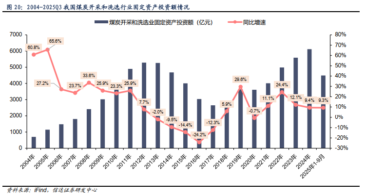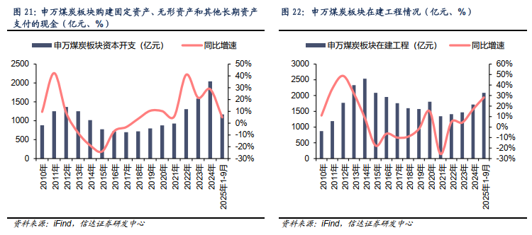 2021年以来煤炭行业固定资产投资进入新一轮增长周期,2022年行业固定资产投资完成额同比增幅达24.4%,随后煤炭行业固定资产投资增速逐年放缓。2023年起,煤炭行业固定资产投资额绝对规模已超越“十二五”期间水平,达到历史新高。但值得注意的是,资本开支的快速增长并不意味着新建矿井产能的大规模上马。我们认为,当前投资增长主要受以下因素驱动:一是智能矿山建设与设备更新改造投资占比显著提升,在政策引导与技术升级双轮驱动下,相关投入已成为资本开支的重要方向;二是井工煤矿为维持持续生产,在准备与开拓巷道等井巷工程方面的投入快速增加,属于维持性资本支出;三是在保供政策要求下,多地加快在建矿井建设进度,导致续建项目投资集中释放。此外,新建矿井吨产能投资显著增加,导致相同规模固定资产投资总额形成的新增产能减少。整体而言,煤炭行业资本开支的增长更多体现为存量产能的维护升级与高效化改造,而非外延式产能扩张。在吨煤投资成本大幅提升的背景下,未来煤炭供给增长将面临更强的成本约束,这对中长期煤炭价格中枢形成有力支撑。