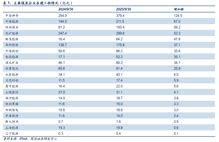 从上市公司资本开支结构来看,煤炭行业投资重心已明显向产业链下游延伸,新建煤炭产能有限,供给弹性持续受限。2025年1-9月,主要煤炭上市公司在建工程金额达2087亿元,同比增长28.2%,延续了自2021年以来的增长态势。从在建工程主要增加企业来看,中国神华、中煤能源、陕西煤业、兖矿能源、新集能源五家企业在建工程合计增加351亿元,成为主要贡献者。从上市公司来看,煤炭资本开支投资方向发生转变,除兖矿能源主要资本开支方面为煤炭产能外,其余公司资本开支主要投向煤电、煤化工等下游领域,直接用于新建煤炭产能的投资相对有限。产业链延伸投资特征反映出,在“双碳”目标背景下,煤炭企业积极向电力、化工等下游产业延伸,通过一体化经营增强抗风险能力。此外,新建煤矿面临审批严格、建设周期长、吨煤投资成本高等多重约束,也导致企业新建煤炭产能意愿相对谨慎。整体而言,当前资本开支增长并未指向煤炭产能的大规模扩张,反而印证了供给端释放面临的刚性约束。