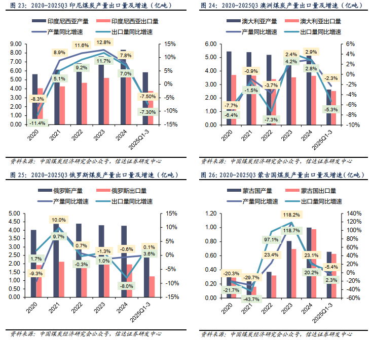 2025年前三季度主要煤炭出口国呈现“增速分化明显,俄蒙展现韧性”的特征。2025年1-9月,全球主要煤炭出口国的生产与出口表现呈现分化态势。从绝对量看,印度尼西亚产量与出口量仍居首位,分别达到5.85亿吨和3.76亿吨;澳大利亚紧随其后,产量与出口量分别为2.63亿吨和2.52亿吨;俄罗斯产量为3.14亿吨,出口量为1.25亿吨;蒙古国产量与出口量分别为0.66亿吨和0.63亿吨。从同比增速看,印度尼西亚产量与出口量双双转为负增长,2025年1-9月,印尼产量同比下滑7.5%,出口量同比下滑7.3%,结束了此前连续数年的高速增长态势。澳大利亚出口量降幅显著大于产量降幅,前三个季度,澳大利亚产量同比微降2.3%,但出口量同比下降5.3%。俄罗斯产量维持稳定,出口量实现正增长,2025年1-9月,其产量同比微增0.1%,基本持平;出口量则实现3.6%的正增长。蒙古国产量小幅下滑,但出口量保持增长,前三季度,蒙古国产量同比下降5.4%,但其出口量仍同比增长2.3%。