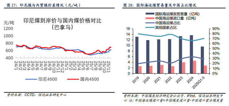 全球海运煤供给或已达平台期,叠加国际市场需求格局变化,制约我国煤炭进口上限。 2025年前三季度,国际海运煤贸易量为9.67亿吨(同比下降4.3%),按此节奏推算,全年总量约为12.89亿吨,将低于2024年的13.72亿吨。我们认为,全球煤炭贸易规模已触及阶段性顶峰,主要出口国如印尼受开采成本上升、澳大利亚受新增项目投产缓慢等因素制约,供给弹性不足,难以支撑我国进口量继续增长。另一方面,国际市场需求格局生变,印度、东盟等新兴经济体煤炭消费仍处高位,持续分流印尼等国的出口资源。与此同时,欧盟、日韩等传统进口区的减量空间已大幅收窄,难以像前几年那样为我国提供额外的进口增量空间。