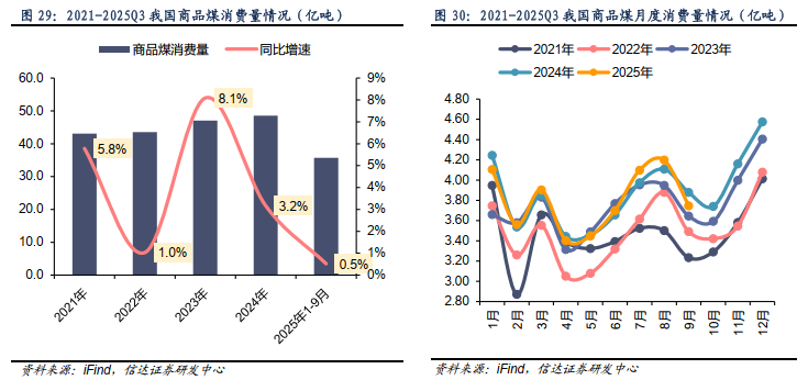 2025年我国商品煤消费量增速有所放缓,电煤需求在极端天气下的增长韧性充足。2025年1-9月,商品煤消费量为35.7亿吨,同比增加0.5%,较2021年以来煤炭消费增速有所放缓。从月度消费量来看,2025年以来月度消费量普遍高于近年同期,尤其是在夏季用电高峰的7月和8月,消费量创下同期历史新高,充分凸显了电煤需求在极端天气下的增长韧性,消费节奏呈现“旺季更旺”特征。