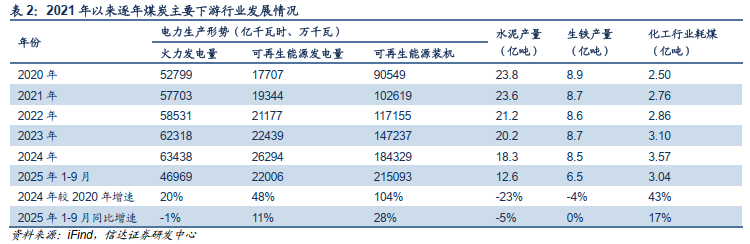 动力煤消费量同比持平,高位平台特征稳固。2025年1-9月,动力煤消费量为30.7亿吨,与去年同期持平。消费量绝对值仍处于历史高位,表明其作为电力、供热等领域基础能源的刚性需求依然稳固。这一方面反映出经济结构转型背景下,高耗能产业需求增长放缓;另一方面也体现了在新能源发电量快速增长的同时,火电的兜底保供作用并未减弱,支撑动力煤消费量在极高基数上企稳。
