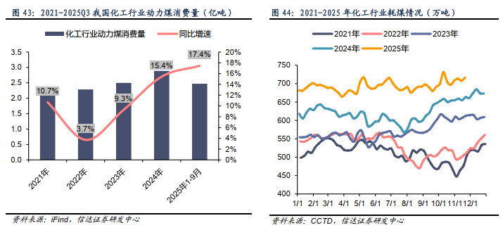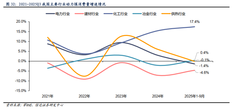 近年来,化工行业煤炭消费呈现持续增长态势,反映煤化工产业快速发展。化工行业动力煤消费量由2021年的2.2亿吨稳步上升至2024年的2.9亿吨,2025年1-9月已达2.5亿吨,同比增速17.4%,成为非电行业中增长最快的行业。在非电领域煤炭消费结构中,化工用煤比重逐年攀升,反映出在现代煤化工政策推动下,煤制烯烃、煤制气、煤制乙二醇等项目产能逐步释放,推动化工原料用煤需求持续扩大。在国际油价中枢维持高位的背景下,煤制烯烃、煤制气等项目的盈利能力稳定,有望推动原料煤及燃料煤需求的持续较快增长。