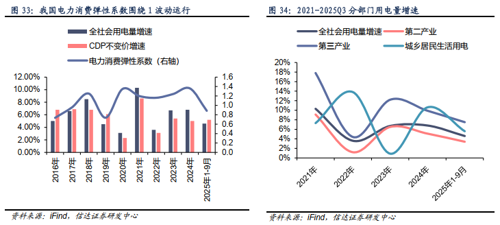 电力弹性系数短期大幅波动,中期看或将围绕1上下波动。2025年1-9月,我国电力消费弹性系数为0.88,较2024年全年的1.36出现大幅下降,也明显低于2021-2024年期间1.16-1.36的波动区间。2025年以来电力弹性系数走低,是短期异常气候、统计基数与长期政策调控、能效提升共同作用的结果。一方面,年初暖冬天气显著压制了采暖用电需求,叠加去年同期较高基数与闰年天数影响,从数据端拉低了弹性系数;另一方面,“能耗双控”等宏观政策的持续约束、电力市场化改革的深入推进以及环保限产措施,共同抑制了高耗能产业用电需求,同时通过价格机制与技术手段提升了全社会的用电效率,促使单位GDP电耗持续下降。分季度来看,2025年Q1、上半年、前三季度电力弹性系数分别为0.46/0.7/0.88。随着季节性扰动减弱和经济内生动力稳步释放,前三季度弹性系数已呈现逐步回升、向常态区间靠拢的态势。从中短期看,受气候、电气化程度进程、产业政策、外贸政策等因素影响,我国电力弹性系数或将围绕1上下波动。从长期趋势看,我国宏观产业结构转型和内部升级将极大重塑用电结构,经济增长对电力的依赖程度持续降低,我国电力弹性系数有望逐步降低。