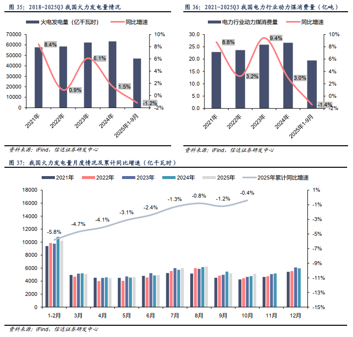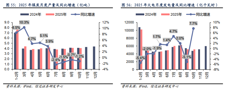 火电需求韧性充足,电煤消费量有望保持高位水平。2025年1-9月,电力行业动力煤消费量为19.5亿吨,同比下降1.4%,与之相对应,同期火电发电量为46969亿千瓦时,同比下降1.2%。 从月度趋势看,火电发电量降幅逐月收窄的特征显著。年初受暖冬、高基数等因素影响,1-2月火电发电量同比大幅下降5.8%。此后,随着经济持续复苏及夏季极端高温天气推动用电负荷攀升,火电发电增速稳步回升。至10月份,火电发电量累计同比增速已收窄至-0.4%,展现出较大的需求韧性。在非化石能源发电占比持续提升的背景下,火电的定位正经历深刻转变,其增长动能不再依赖于发电总量的快速扩张,而是体现在应对极端天气、弥补新能源出力波动,以及保障电力平衡方面的调节价值。随着全社会用电量的持续增长和火电“压舱石”角色的深化,火电发电量及对应的动力煤消费量有望维持高位水平。