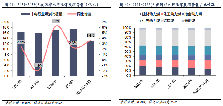非电行业煤炭消费总体呈增长趋势,非电行业内部煤炭消费呈现明显结构性变化,化工用煤显著增长,建材耗煤下降,冶金用煤维持稳态。从消费总量来看,2025年1-9月我国非电行业煤炭消费量为13.1亿吨,同比增加3.6%。2021年以来整体呈现波动增长态势,2023年增速较为显著达到6.2%。从消费结构来看,非电行业内部煤炭消费呈现明显结构性变化。化工行业用煤占比持续提升,化工动力煤从2021年的13%上升至2025年1-9月的19%,无烟煤从2021年的3.4%上升至2025年1-9月的4.4%,反映煤化工产业快速发展。建材行业用煤占比显著下降,从2021年的20%降至2025年1-9月的14%,降幅明显。冶金用煤占比保持稳定,冶金动力煤2025年1-9月占比为10%,较2021年持平;炼焦煤从2021年的33%上升至2025年1-9月的34%,呈现趋稳态势。