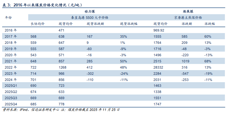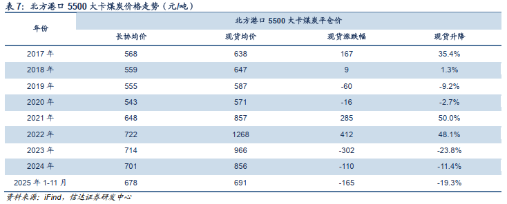2025年秦皇岛港5500K动力煤均价回落,跌幅较2024年小幅扩大。截至2025年11月25日,今年秦皇岛港5500K动力煤均价为690元/吨,较2024年均价856元/吨下跌约166元/吨,同比下降19%。从波动幅度来看,2025年均价下降幅度较2024年有所扩大,主要是在上半年供需阶段性过剩影响下价格短期跌幅较大。随着2025年7月后供给收缩叠加需求改善,煤炭价格呈现企稳回升态势。