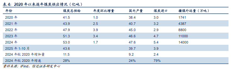 2025年以来,国内原煤产量增速实现小幅提升,但在进口煤同比大幅下滑背景下,煤炭总体供给增速呈现明显放缓态势。国内产量方面,2025年1-10月,全国原煤产量达39.7亿吨,同比增长1.5%,增速较2024年全年水平有所回升,主要是2025上半年原煤产量增速较快。 进口方面,2025年1-10月煤炭进口量为3.88亿吨,同比大幅下降11%,成为拉低总供给增速的主要因素。我们认为,进口量下滑既与海外煤价优势收窄、部分时段出现价格倒挂有关,也受国际海运市场供需格局调整的影响。总供给方面,2025年1-10月,包含进口在内的煤炭表观供给总量为43.6亿吨,同比增速仅为0.8%,较2024年全年3.3%的增速水平大幅回落。我们认为,在国内产量增长潜力有限、进口支撑减弱的背景下,煤炭总供给已进入低速增长区间,供需平衡仍面临结构性紧约束,对中长期煤价中枢形成重要支撑。