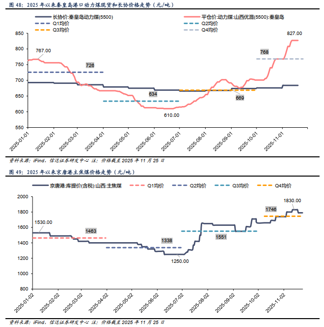 ⚫ 煤价中枢震荡下移,有望保持合理区间运行。2025年煤炭价格呈“V型”走势,中枢下移但底部明确,政策与成本共同支撑价格在合理区间运行。