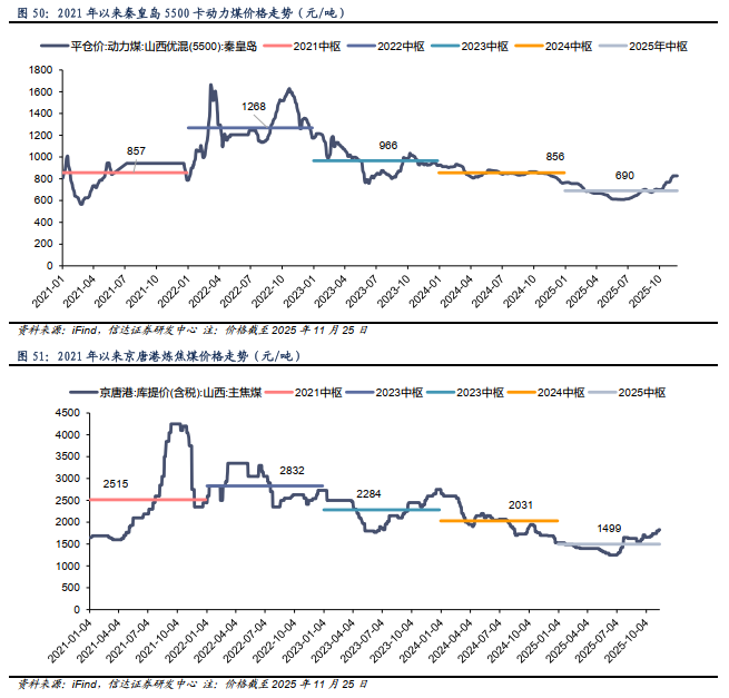 政策引导与成本支撑,价格有望合理区间运行。政策端方面,2025年7月国家能源局印发核查通知,强化产能约束,扭转“越超产越降价”困局。11月发改委调整长协定价机制,引入产地“基准价 浮动价”模式,增强履约可行性,有望降低市场煤价格波动性。成本端方面,依据我们研究成果,从国内煤炭高成本供给边际增量角度来看,我们预计2026年秦港5500大卡价格中枢约为730-760元/吨,京唐港主焦煤价格中枢约为1700-1800元/吨。需跟踪后续疆煤外运铁路运费优惠下浮情况。