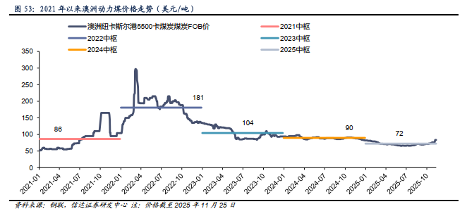 2025年印尼和澳洲动力煤中枢价格回落。截至2025年11月25日,印尼加里曼丹岛3800大卡煤炭均价为47美元/吨,较2024年均价56美元/吨下跌约9美元/吨,同比下降16%,2025年均价下降幅度较2024年小幅扩大。截至2025年11月25日,澳洲纽卡斯尔港5500大卡煤炭均价为72美元/吨,较2024年均价90美元/吨下跌约18美元/吨,同比下降20%,2025年均价下降幅度较2024年有所扩大。