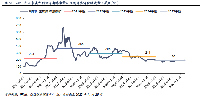 海外炼焦煤价格年内价格走势趋稳,中枢价格下移。截至2025年11月25日,澳洲峰景煤矿焦煤均价为186美元/吨,较2024年均价2416美元/吨下跌约55美元/吨,同比下降23%,2025年均价下降幅度较2024年有所扩大。