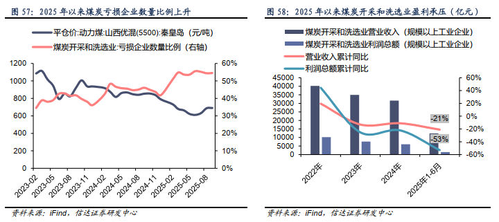 以量补价煤炭价格进一步下行,行业盈利承压。在煤价下行压力下,部分煤矿企业为维持现金流与市场份额,被动采取“以量补价”策略,进一步加剧市场供需宽松的格局,逐步形成“价格下跌—经营亏损扩大—被动增产保收—市场供应过剩—价格进一步承压”的负向循环,行业整体盈利承压明显。2025年1-6月,煤炭开采和洗选业营业收入实现12425亿元,同比下降21%;实现利润总额1429亿元,同比下降53%。