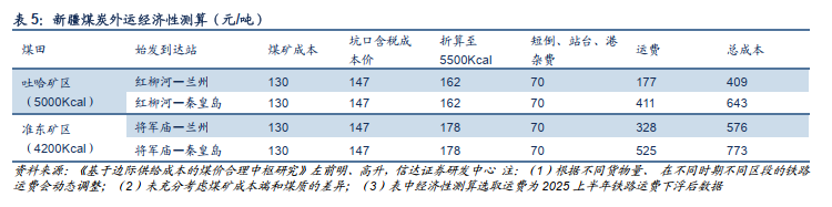 折算至秦皇岛港5500Kcal煤炭后,吐哈和准东地区对应的煤炭外运成本分别为643-773元/吨。新疆煤价与秦皇岛港口煤价既有相关性也有独立性,疆煤产量也受港口煤价波动影响,但影响相对滞后,疆煤价格波动缓慢。新疆煤炭主要从吐哈和准东地区外运至甘肃、宁夏、重庆等地区,具有疆内开采成本低、出疆运输费用高的特点,其外运成本主要从其动态和静态的外运经济性考量。从疆煤外运静态刚性成本的视角来看,新疆准东和吐哈地区的煤炭分别运送至甘肃、秦皇岛等地区,按照露天矿完全成本130元/吨、2024年12月的铁路运费测算,折算至秦皇岛港5500Kcal煤炭后,吐哈和准东地区对应的煤炭外运成本分别为643-773元/吨。值得注意的是,铁路运费下浮导致价格支撑下限降低,未来仍需进一步关注铁路运费变化情况。