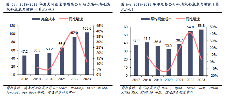 从印尼煤炭开采成本看,印尼不同矿山的成本略有差异,加里曼丹岛的矿山生产成本相对较低,而苏门答腊岛的矿山由于工业发展较晚,生产成本相对较高。近年来,主要煤炭公司剥采比的抬升推高了开采成本,且煤炭运至港口的运输成本也明显增加。2017-2023年,主要煤炭公司的平均现金成本呈现先下降后上升的走势,2020年平均完全成本32.5美元/吨,为5年最低。随着经济逐渐好转及特许经营使用权费用支出增长,2023年平均完全成本56.8美元/吨,较2020年增长74.8%。此外,根据IEA统计,印尼4500Kcal以下的动力煤产能约为1.7亿吨,2023年,随着开采成本、运输成本以及特许使用权相关费用支出的增加,印尼低卡动力煤的价格已迫近成本曲线。