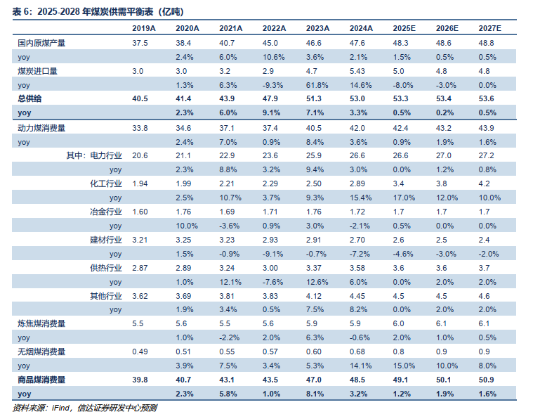 综合上述观点,我们预计2025-2028年期间煤炭供给和需求情况如下表所示。