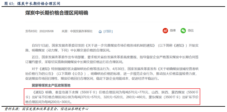 从政策引导来看,2022年5月,国家发展改革委印发《关于进一步完善煤炭市场价格形成机制的通知》,明确煤炭中长期交易价格的合理区间,文件明确秦皇岛港下水煤(5500千卡)价格合理区间为每吨570元~770元,山西、陕西、蒙西煤炭(5500千卡)出矿环节价格合理区间分别为每吨370元~570元、320元~520元、260元~460元。秦皇岛、山西、陕西、蒙西价格合理区间中值分别为670、470、420、360元/吨。