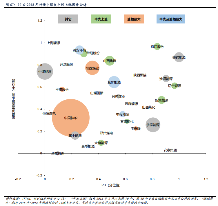 2016-2018年行情中,中小估值、成长性高的标的率先上涨,低估值标的涨幅较大。从估值、利润增长率、市值规模三个维度分析,在2016-2018年煤炭板块上涨行情中,率先上涨主要是中小估值、归母净利润增长潜力较高的煤炭上市公司,在区域分布上山西煤炭上市公司数量较多,华阳股份、山西焦煤、潞安环能、山煤国际均位于山西。在2016-2018年煤炭板块上涨行情中,涨幅最大主要是估值较低的煤炭上市公司,高市值、大体量公司占比较率先上涨标的中占比有显著抬升,中国神华、陕西煤业、兖矿能源等大市值标的涨幅均较高。