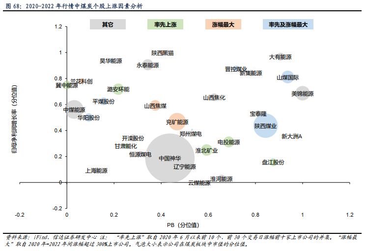 2020-2022年行情中,成长性高的标的率先上涨,兼具成长性与估值性价比的标的涨幅较大。从估值、利润增长率、市值规模三个维度分析,在2020-2022年煤炭板块上涨行情中,率先上涨主要是归母净利润成长率高的煤炭上市公司,如冀中能源、华阳股份、平煤股份、潞安环能。在2020-2022年煤炭板块上涨行情中,涨幅居前主要是估值较低且有一定成长性的煤炭上市公司如兖矿能源、山西焦煤等。