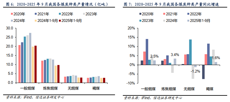从煤种结构来看,2025年1-9月全国煤炭产量同比增长2%,各煤种呈现明显的结构性分化,其中炼焦烟煤实现增速由负转正。具体来看:一般烟煤作为产量主体,1-9月产量为20.4亿吨,同比增长2.5%,增速较2024年有所放缓,但仍贡献了最主要的供给增量。炼焦烟煤2025年1-9月产量为9.8亿吨,同比增长3.4%,较2024年全年-4.3%的负增长实现显著改善,主要是炼焦煤主产地山西产量恢复性增长。 无烟煤产量同比小幅下降1.2%,但降幅较2024年全年的-7.6%已显著收窄。褐煤产量同比增长1.6%,增速明显放缓。
