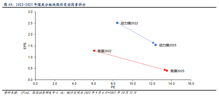 煤炭板块自2022年9月起呈现回调态势,炼焦煤、动力煤EPS均有所下滑,其中炼焦煤降幅最大为69%,动力煤降幅为39%,体现了焦煤较高的业绩弹性。受业绩下行幅度大于股价影响,焦煤、动力煤板块估值有所被动抬升,其中焦煤板块抬升最大为124%,动力煤板块抬升47%。