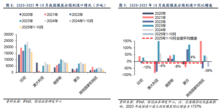 进口方面,2025年1-10月我国煤炭进口量同比下降11%,主要来源国进口表现呈现“印尼主降、蒙煤独增、澳俄微降”的结构性分化特征。