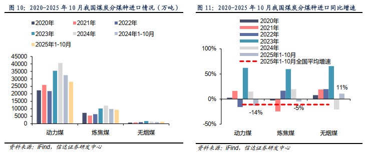 国内产量方面,分地域来看,2025年1-10月全国原煤产量同比增长1.5%,区域结构呈现“晋增新缓、陕稳蒙降”的特征,增长主力主要来自山西省的恢复性增产。