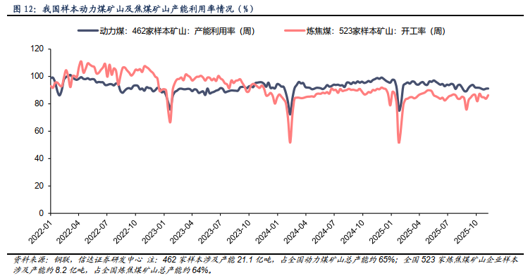 国内煤矿产能利用率仍维持相对较高水平,整体供给弹性受限。 从样本矿山数据来看,2022年以来动力煤与炼焦煤矿井的产能利用率呈现分化态势,但整体仍处于较高区间,反映出国内煤炭供给释放已接近上限。动力煤矿井产能利用率保持稳定,2022-2025年始终维持在90%以上的高位,2025年样本矿井利用率均值为93%。这表明主力动力煤矿区产能已得到充分挖掘,后续增产空间极为有限。炼焦煤矿井产能利用率则呈现趋势性下行,从2022年的102%逐步回落至2025年的84%。我们认为,这既与焦煤资源禀赋衰减、开采难度加大有关,也受安监政策持续强化及部分矿井资源接续困难的影响。整体而言,在国内煤炭产能利用率整体高企的背景下,供给端已难以通过提升开采强度来实现显著增量。动力煤产能利用率的稳定高位与炼焦煤利用率的趋势性回落,共同指向未来煤炭供给增长将更多依赖于新建产能的释放,而非存量矿井的进一步挖潜。