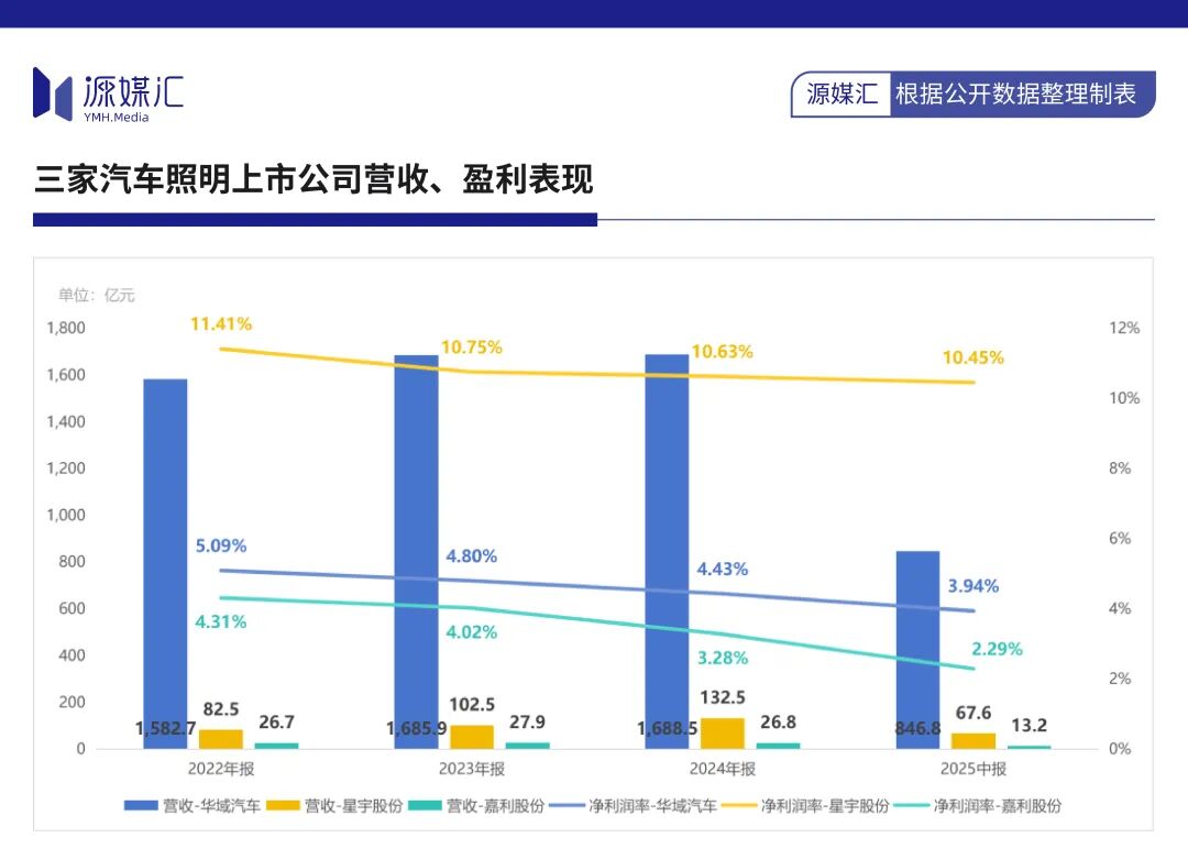 透过历年财报可以发现,作为一家小型汽车照明供应商,嘉利股份在艰难求存。2022年至2024年,公司盈利在27亿元左右,净利润在1亿元左右,净利润率则从4.3%下降至3.28%,2025年中期营收为13.2亿元,净利润率为2.29%。