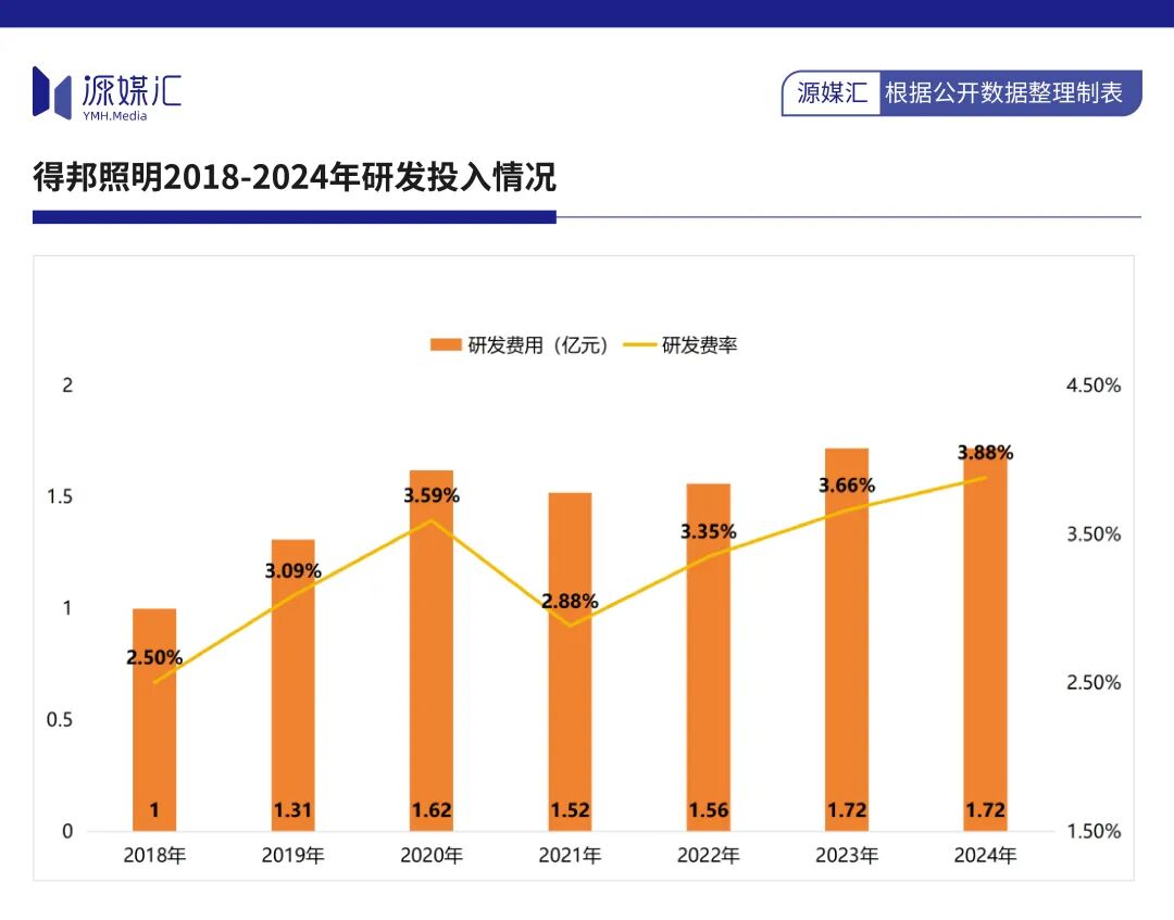 2020年至2024年,得邦照明的研发费用区间值为1.52亿-1.72亿元,研发费率区间值为2.88%-3.88%。