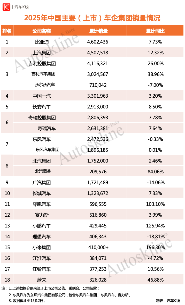 长安汽车发布公告显示,2025年销量291.3万辆,同比增长8.54%,在中国主要上市车企集团中,仅次于比亚迪、上汽集团、吉利控股集团和中国一汽,位列第五。