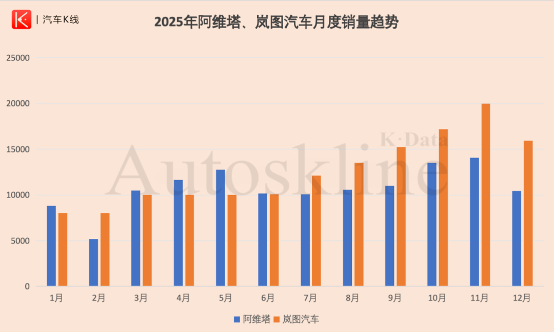 东风旗下岚图品牌,2025年表现强劲,全年销售15.02万辆,同比增长87%。虽然长安的阿维塔从2025年3月起,实现连续9个月销量破万,但相比岚图在2025年最后4个月稳稳站上1.5万辆规模,甚至月销突破2万辆,差距正在被拉大。