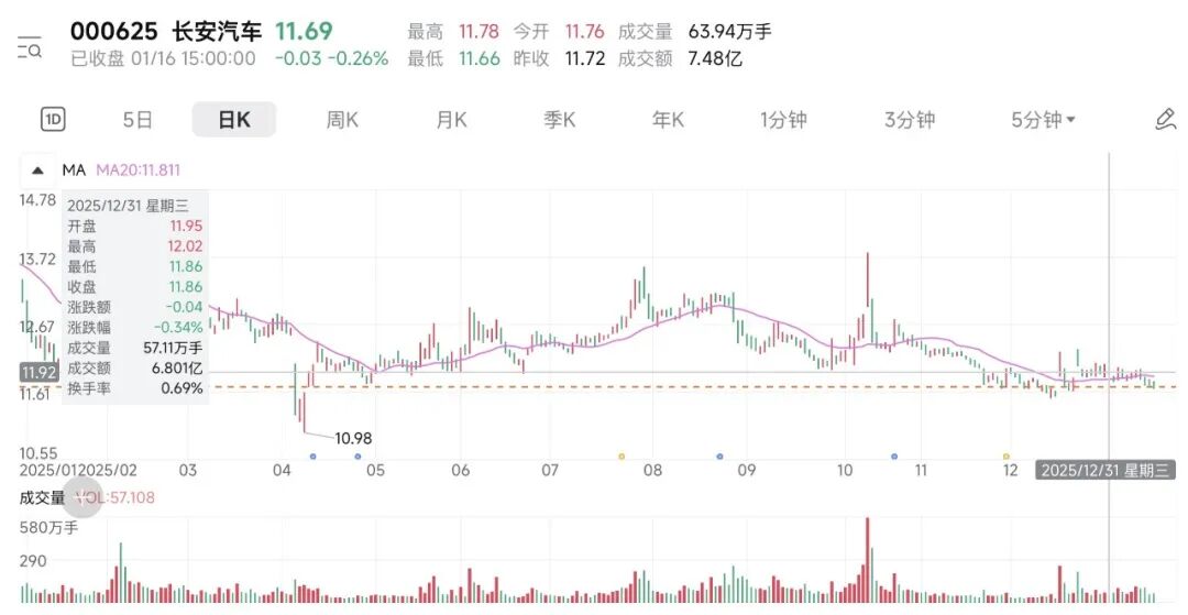 整个2025年,长安汽车股价收跌8.91%,市值缩水近116亿元。截至1月16日收盘,长安汽车报收11.69元/股。