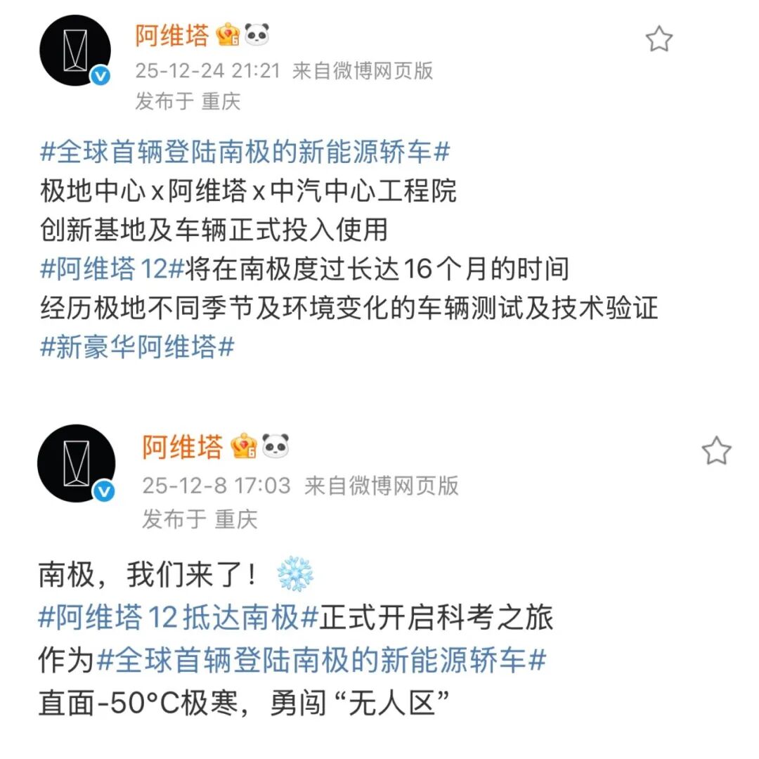 就像2025年末,阿维塔在社交媒体上宣传车辆运抵南极进行极寒测试,却因南极正值夏季、极端低温罕见而引发质疑。时隔半个月,阿维塔官方才发文澄清,表示车型将在南极度过16个月时间。